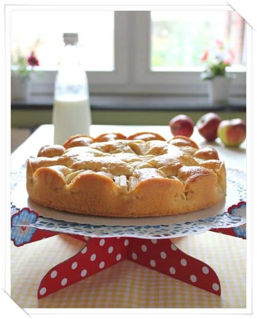Llenamos el molde con la masa y lo alisamos con una espatula. Colocamos las manzanas en forma de corona o anillo encima de la masa.